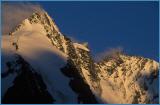Der höchste Berg Österreichs, der Grossglockner (3.798 m) erstrahlt im ersten Morgenlicht. Gut zu erkennen sind die Bergsteiger, die bereits zu früher Stunde Richtung Gipfel steigen.